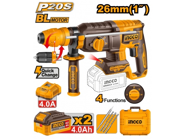 ROTOMARTILLO A BATERIA 26MM P20S 20V 2.5J SDS PLUS + 2 BAT 4.0AH + CARGADOR + ACCESORIOS + VALIJA INGCO CRHLI202689