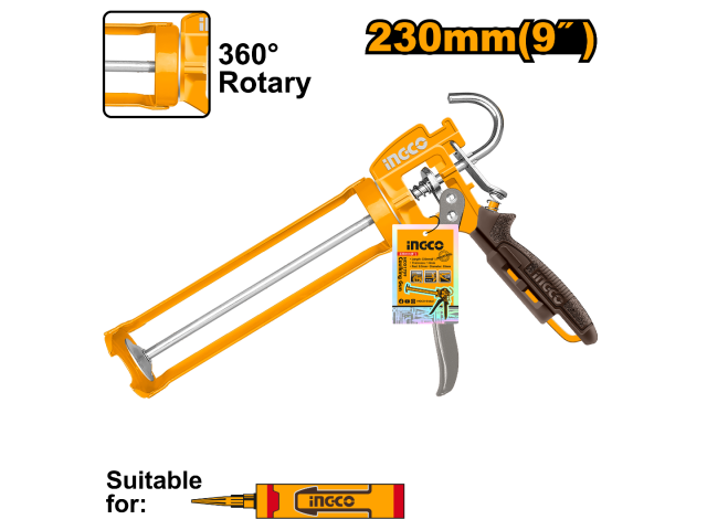 Pistola de calafateo 9 " Mango de aluminio fuerte Longitud: 235mm Con función rotativa Espesor: 1.8 mm Diámetro: 55 mm Varilla lisa: 8.0 mm Embalado con tarjeta de papel