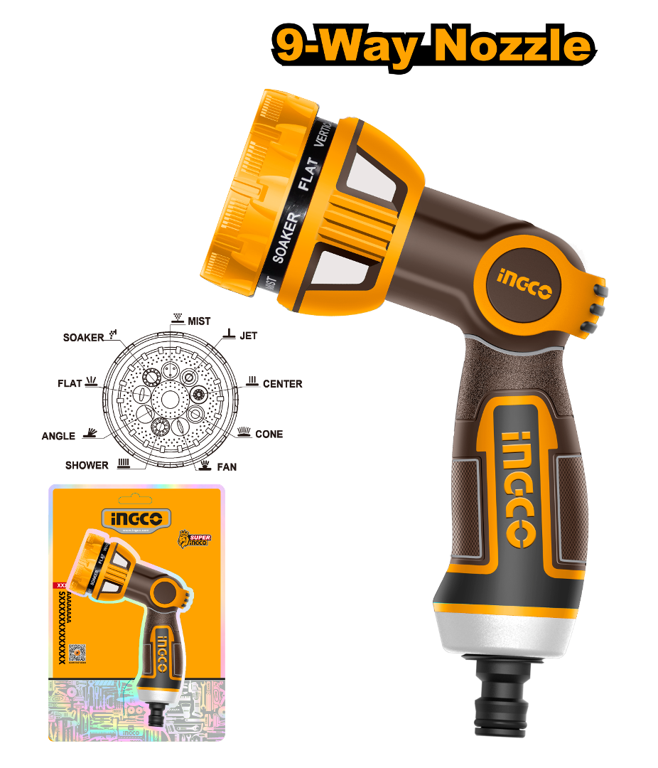 -9 patrones de rociado, que incluyen ducha, ángulo, centro, ventilador, cono, chorro, niebla, remojo, plano.