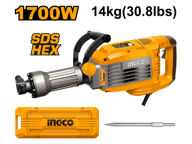 MARTILLO DEMOLEDOR 50J 1700W 14KG SDS HEX C VALIJA Y PUNTA INGCO PDB170068