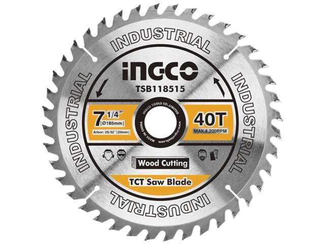 185 mm (7-1 / 4 ") 40T, cenador: 20 mm Con anillo de reducción de 16 mm Apto para sierra circular Para el artículo CS18528 de INGCO Embalado por caja de color