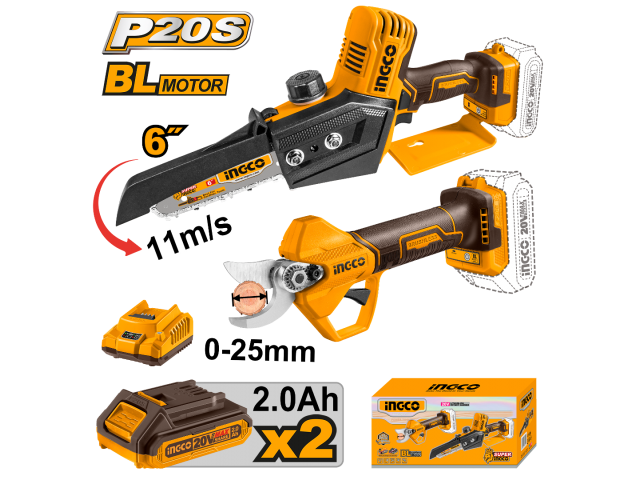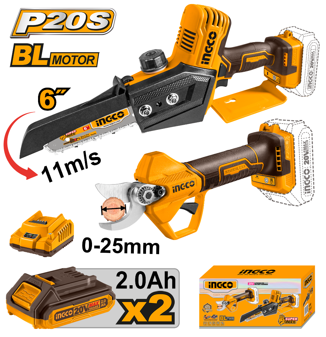 COMBO MINI MOTOSIERRA 6" 20V P20S + TIJERA PODA 20V + 2X BAT 2AHA + CARG INGCO