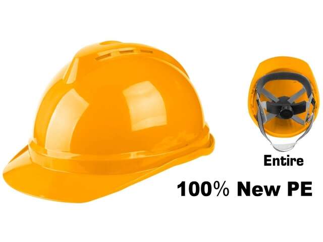 Carcasa de PE con ventilaciones Material de revestimiento: cinta Correa para la barbilla incluida Color amarillo Peso: 380 g " V " - Tipo refuerzo superior Suspensión de 4 puntos Ajuste el Tamaño de la cabeza con la perilla de trinquete