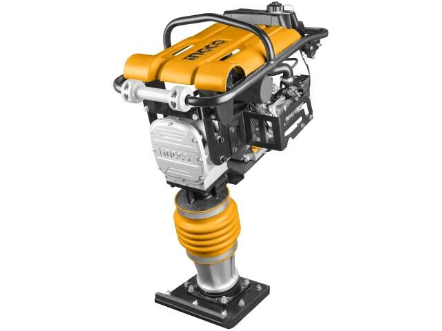 Motor de gasolina INGCO Potencia del motor: 4.8Kw (6.5HP) Peso: 79Kgs Fuerza de impacto: 10kN Velocidad de impacto: 450-660 rpm Carrera de salto: 65 mm Tamaño del zapato: 33x29 cm Volumen del tanque de combustible: 2.0L Embalado por caja de cartón