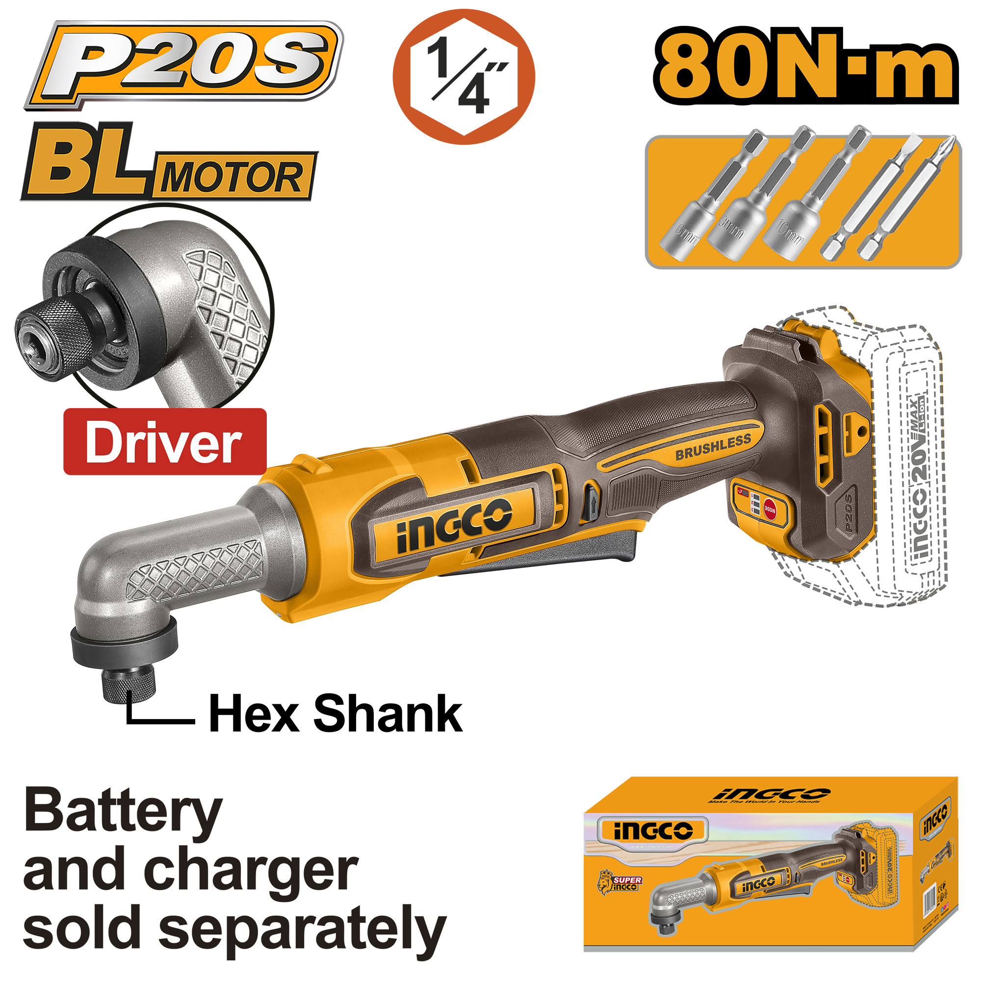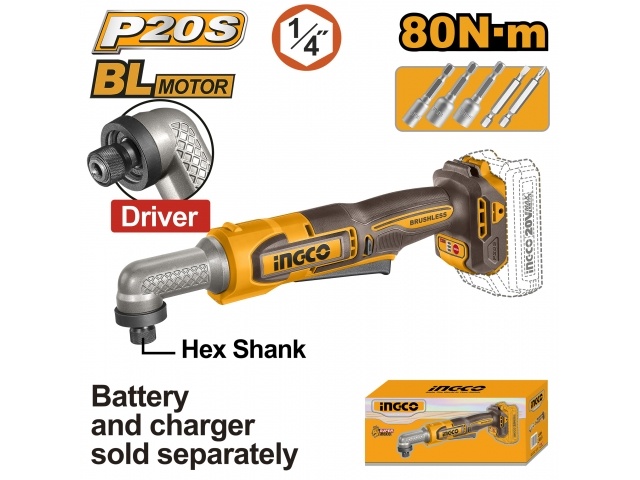 ATORNILLADOR ANGULAR 80NM A BATERIA 20V P20S CON ACCESORIOS SIN BATERIA SIN CARGADOR INGCO CAIRLI2081