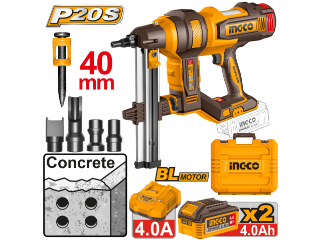 CLAVADORA P/CONCRETO A BATERIA 20V 40MM BRUSHLESS C/ 2 BAT 4.0AH + CARGADOR + ACCESORIOS + VALIJA INGCO CCNLI9008