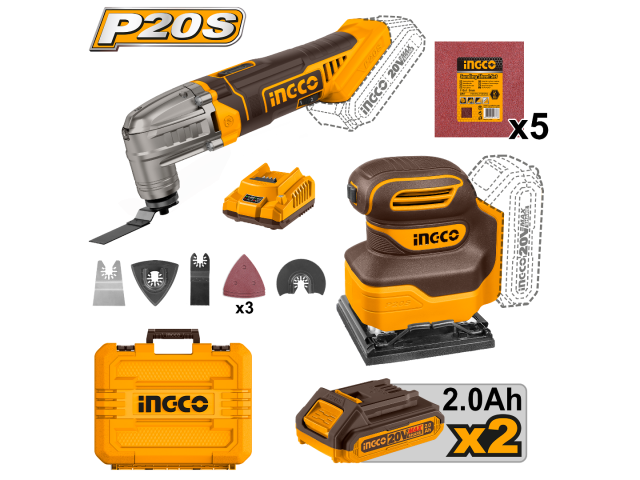 COMBO LIJADORA ORBITAL 20V P20S + HERRAMIENTA MULTIFUNCION 20V + 2X BAT 2AH + VALIJA