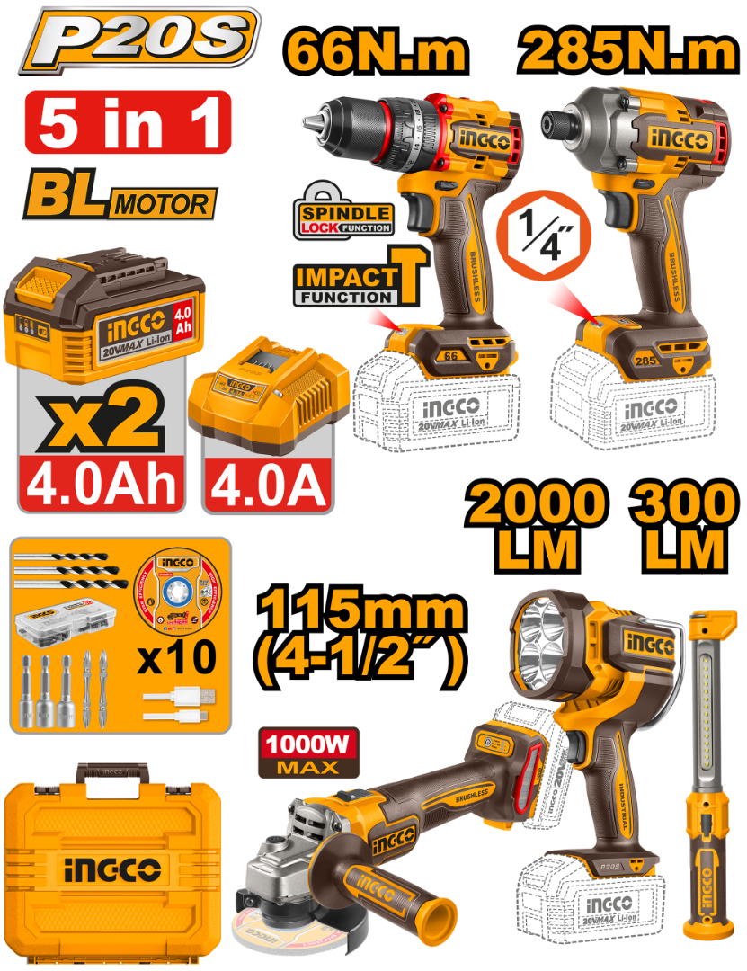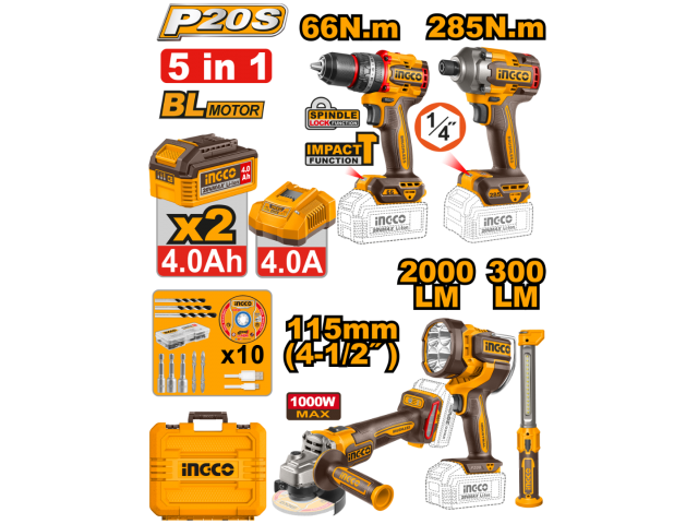 KIT COMBO A BATERIA 5 EN 1 P20S 20V BRUSHLESS TALADRO ATORN. C/PERCUTOR 66NM + ATORNILLADOR DE IMPACTO 285NM + AMOLADORA ANGULAR 115MM + 2 LINTERNAS LED C/ 2 BAT 4.0AH + CARGADOR + ACCESORIOS + VALIJA INGCO COSLI250692