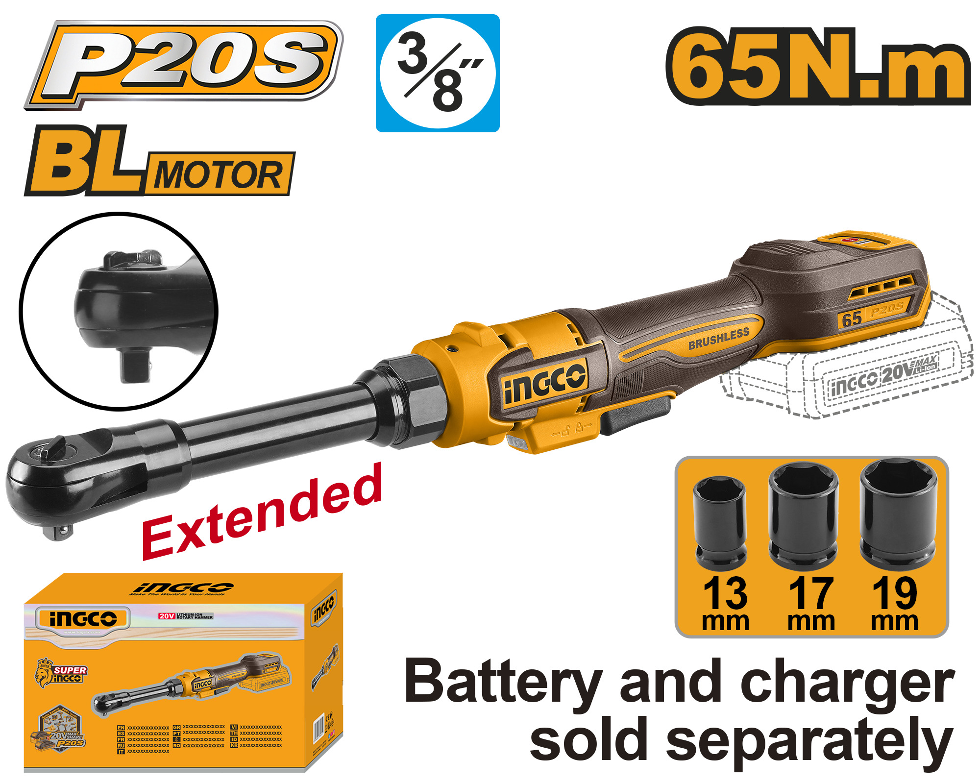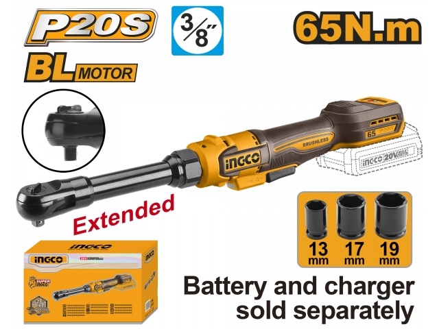 LLAVE CRIQUE 65NM A BATERIA 20V P20S + 3 DADOS 13,17,19MM SIN BATERIA SIN CARGADOR INGCO CDRLI206529