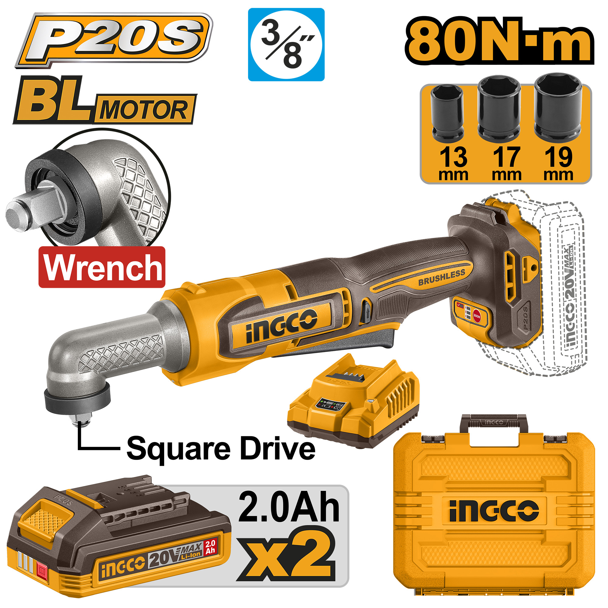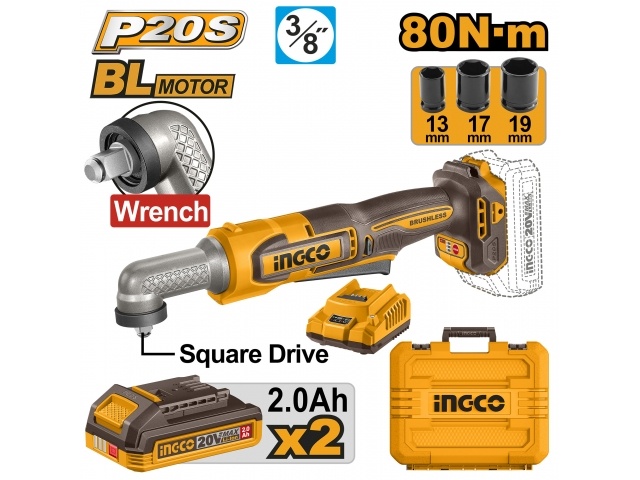 LLAVE DE IMPACTO ANGULAR 80NM A BATERIA 20V P20S CON 2 BATERIAS 2.0AH + CARGADOR + 3 DADOS 13,17,19MM + VALIJA INGCO CAI