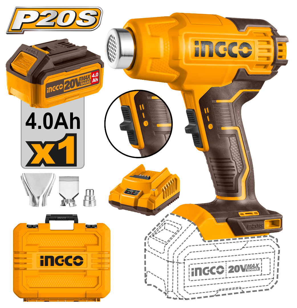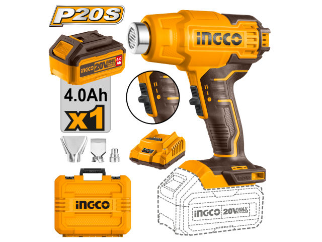 PISTOLA DE CALOR A BATERIA 20V P20S 550ºC + BATERIA 4 Ah+ CARGADOR HGLI20025 INGCO
