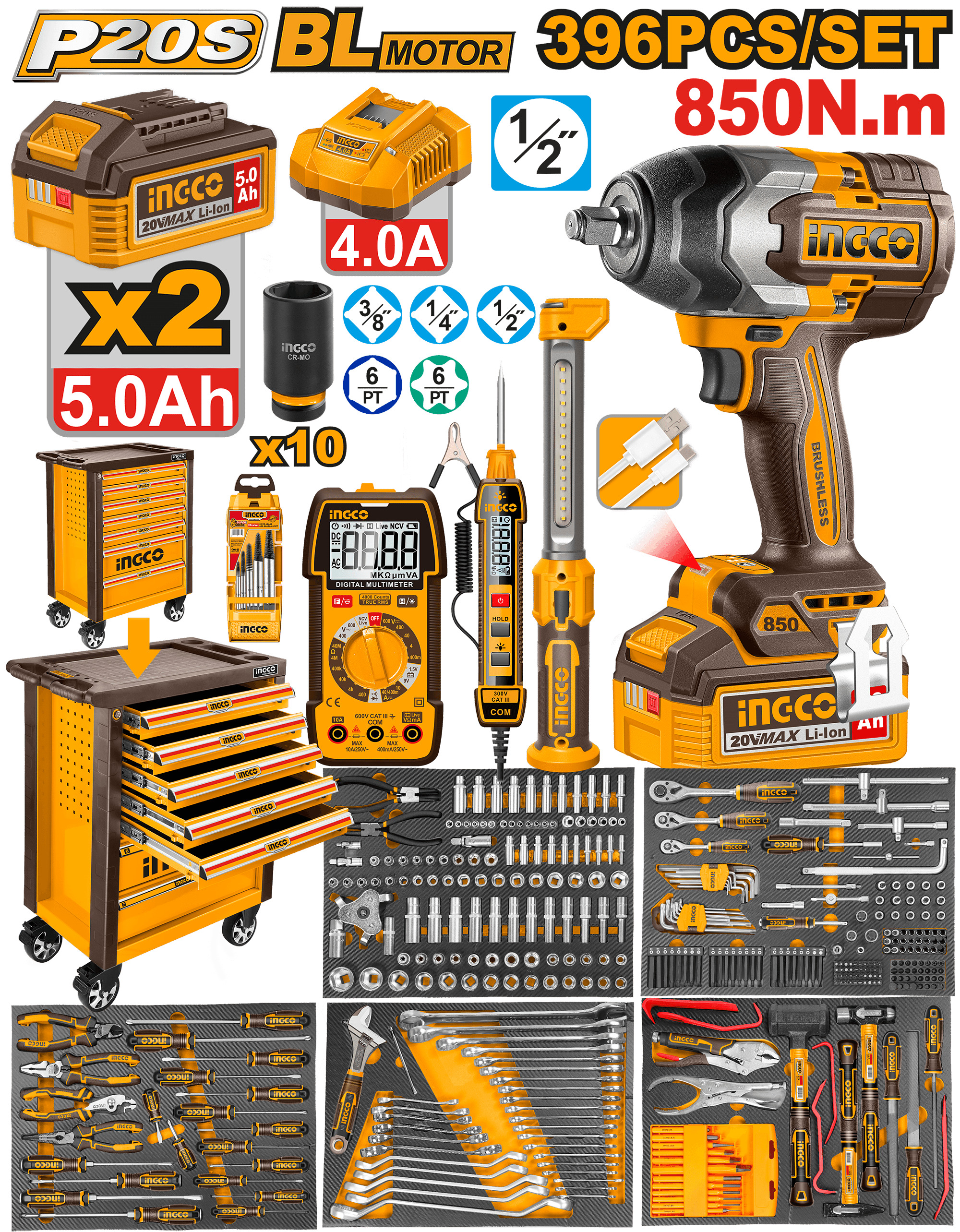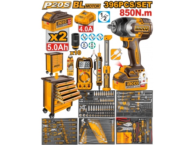 SET 369 HERRAMIENTAS CON 2 BATERIAS 5.0AH + CARGADOR + ACCESORIOS INGCO HTCS283962