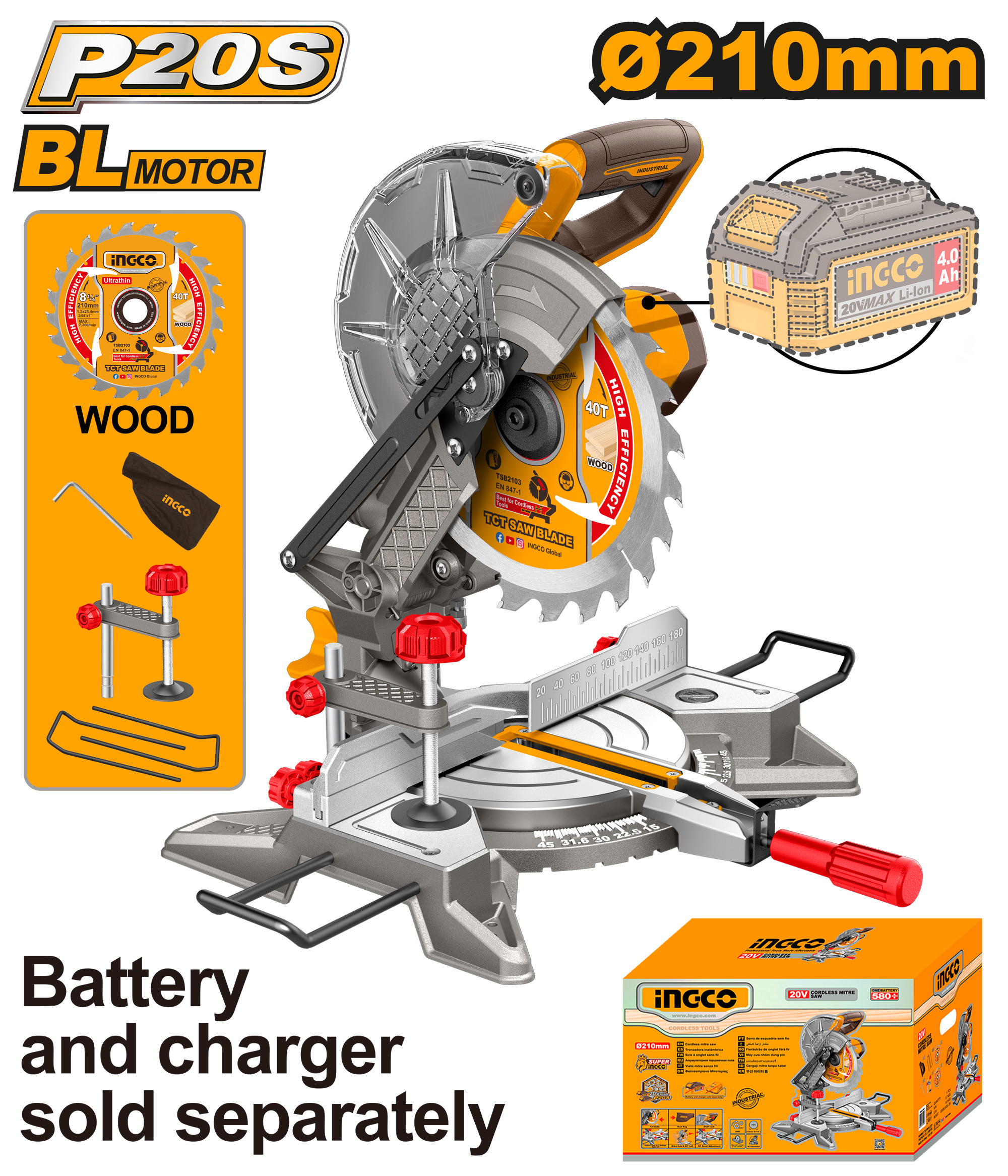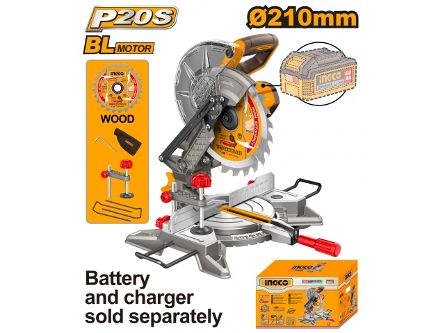 SIERRA INGLETADORA A BATERIA 20V 210MM + ACCESORIOS SIN BATERIA SIN CARGADOR INGCO CMSLI2021