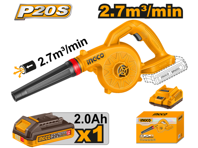 SOPLADORA A BATERIA P20S 20V 2.7M³/MIN C/BAT 2.0AH + CARGADOR INGCO CABLI20781