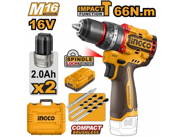 TALADRO ATORNILLADOR C/PERCUTOR 16V M16 66NM CON 2 BATERIAS 2.0AH + CARGADOR + 4 MECHAS + VALIJA INGCO CIDLI166062