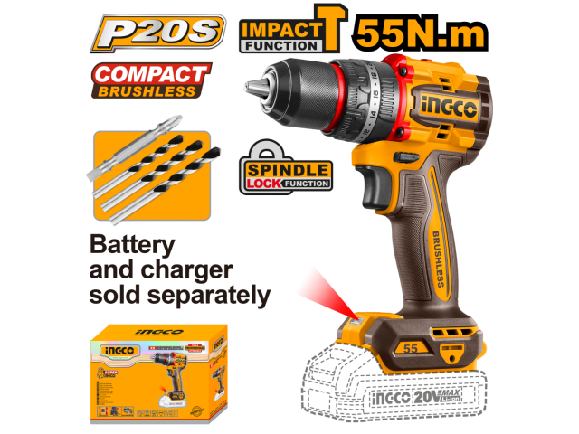 TALADRO ATORNILLADOR C/PERCUTOR A BATERIA 20V P20S BRUSHLESS 55NM CON ACCESORIOS, S/BAT Y S/CARG  INGCO CIDLI205581
