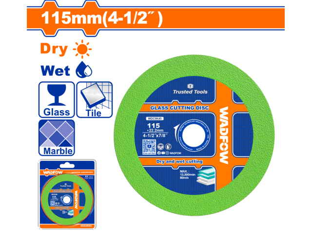 DISCO CORTE VIDRIO 4 1/2" X 22.2MM C/ANILLO REDUCTOR 20MM WADFOW WDC9K45