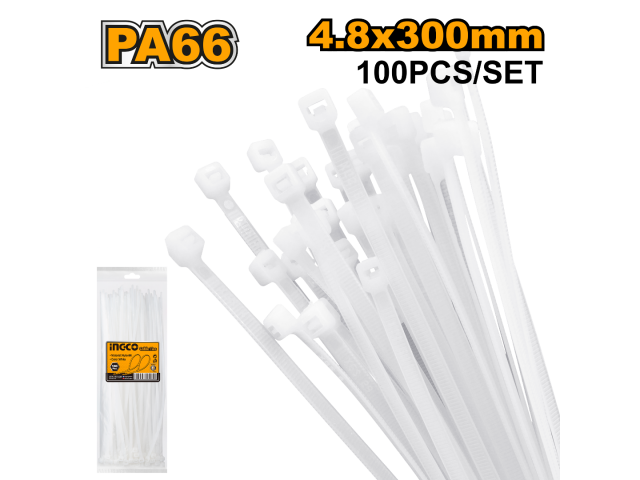Color blanco Material: nylon 66 Longitud: 300mm Ancho: 4.8 mm 100pza / juego garantía de dos años Embalado por etiqueta