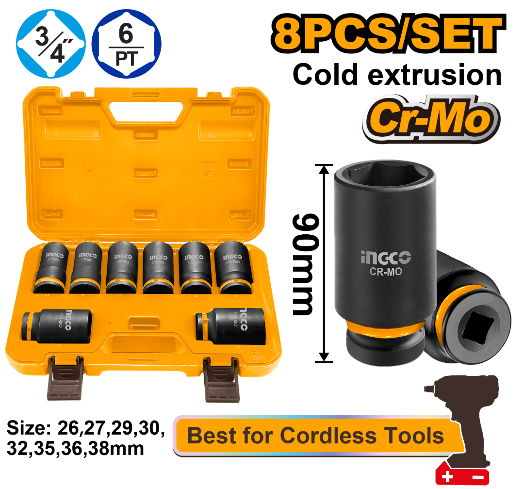 VALIJA 8PCS JUEGO DE DADOS DE IMPACTO PROFUNDO 3/4" INGCO HKISSD34082L