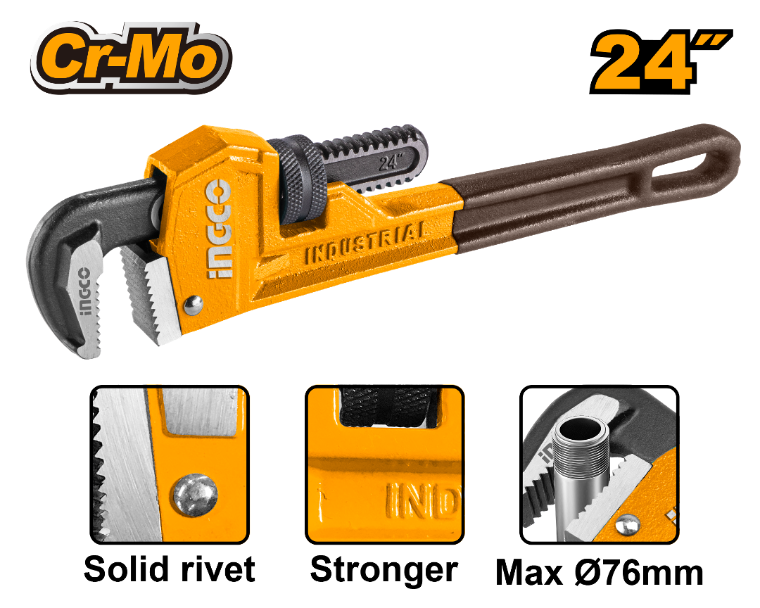 Tamaño: 24 " Diámetro máximo de sujeción: 76 mm Mordaza móvil forjada con acero al carbono de alta calidad. Inactivar tratamiento Material del cuerpo: fundición dúctil Acabado negro y pulido Remache sólido Embalado con tarjeta de papel