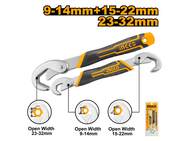 1 pza llave de doble extremo abierto, 9-14 mm, 15-22 mm 1 pza llave de extremo abierto simple, 23-32 mm Cromado Mango bicolor Embalado por tarjeta deslizante