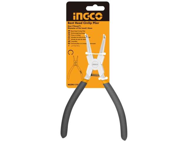 Alicate circlip cabeza doblada Alicate de circlip interno Tamaño: 7 " / 180 mm Diámetro de la cabeza: 1.8 mm Acero carbono Embalado por percha PP