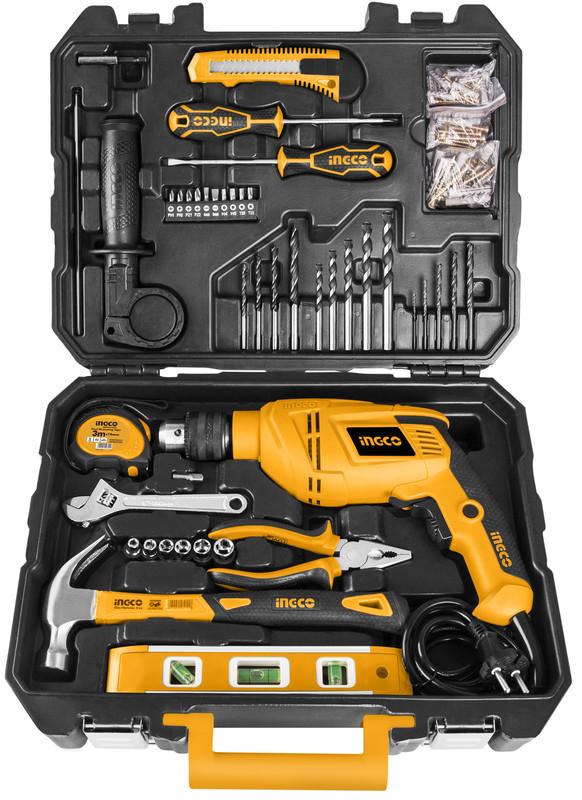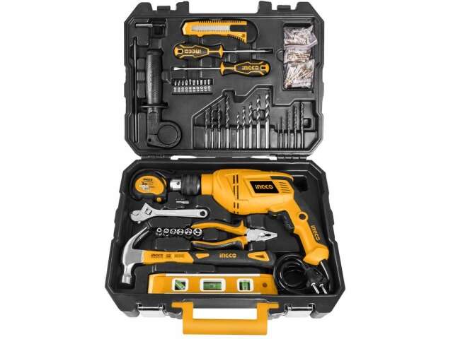 Juego de herramientas de 101 pzas 1 pza de taladro de impacto 650W 220-240V / 50Hz, portabrocas de 13 mm 1 pza 8 oz martillo Destornillador SL5.5x100 de 1 pza Destornillador PH1x100 de 1 pza 1 pza de alicates combinados de 6 " 1 pza de llave ajustable de 6 " 1 pza Mini nivel de espíritu 1 pza de cinta métrica de acero 3M 1 pza de cuchilla de corte a presión Brocas helicoidales de 5 pzas 2,3,4,5,6mm Brocas de albañilería de 5 pzas 4,5,6,8,10mm 4 pzas de brocas de madera 4,5,6,8mm 6 pzas 1/4 " Hexagonal Hembra 5mm 6mm 8mm 9mm 10mm 11mm Adaptador de Enchufe de 1 pzas de 4-6 mm (25 mm) Puntas de destornillador de 10 pzas PH1, PH2, PZ1, PZ2, SL4, SL6, Hex4, Hex5, T20, T25 Soporte para brocas magnéticas de 1 pza Tornillos de 30 pzas (10 pzas * ST3.5,10pza * ST4,10pza * ST5) 30 pzas de tapones de plástico (10 pzas * 5 mm, 10 pzas * 6 mm, 10 pzas * 8 mm) Embalado por BMC