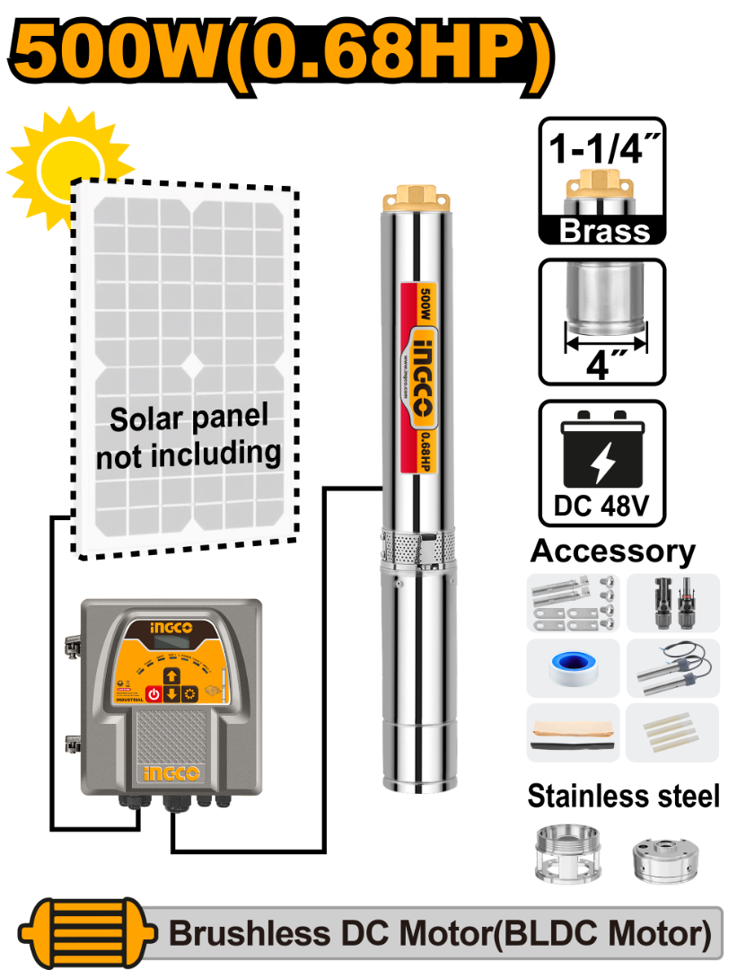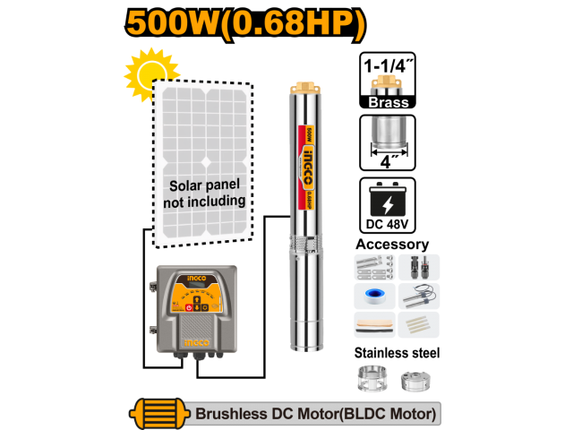 BOMBA SOLAR POZO SEMISURGENTE 500W (0.68HP) 48V ALTURA 78M CAUDAL 4M3/H S/PANEL SOLAR INGCO DWPDC50061