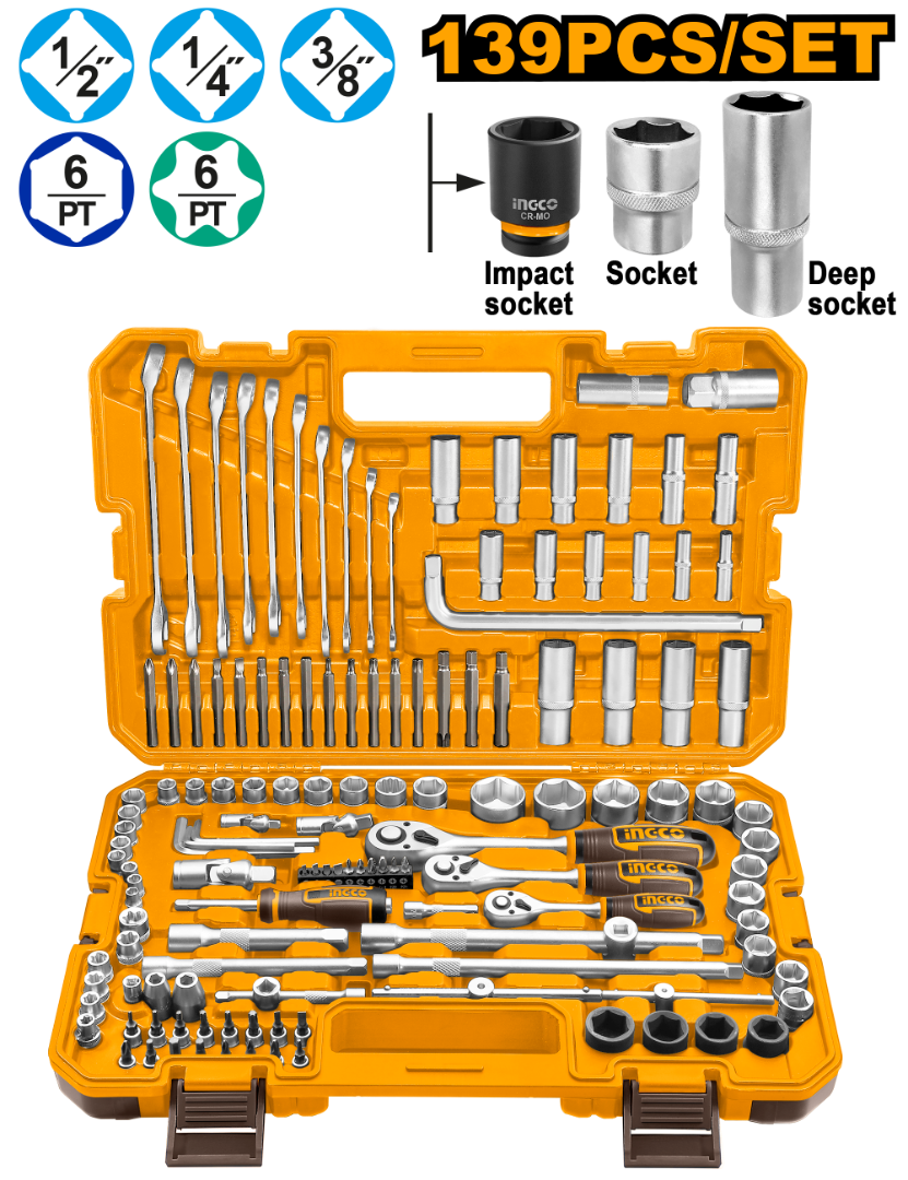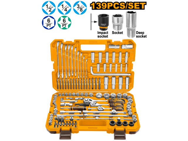 SET X139 HERRAMIENTAS COMBINADAS C/DADOS, LLAVES, PUNTAS Y ACCESORIOS EN VALIJA PLASTICA INGCO HKTHP21391.