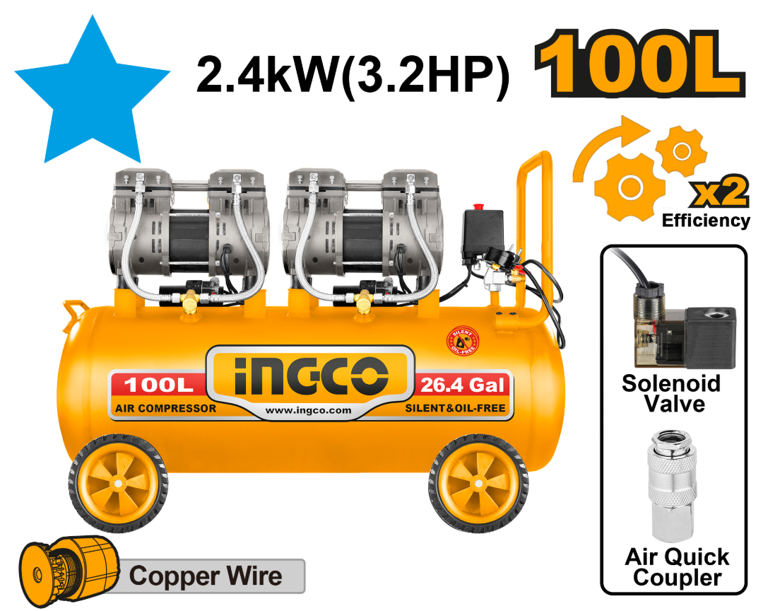 COMPRESOR DE AIRE 100L 3.2HP 8BAR (LIBRE DE ACEITE) INGCO ACS2241001