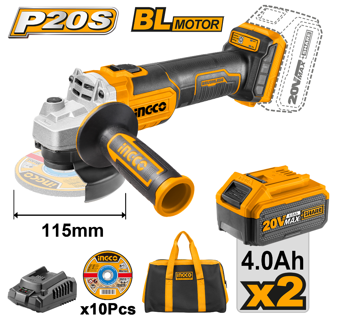 AMOLADORA A BATERIA 20V P20S + 2 BAT + CARGADOR + DISCOS Y BOLSO CAGLI2011582 INGCO