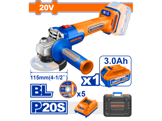AMOLADORA A BATERIA BRUSHLESS 20V C/ BAT 3.0 AMP + CARGADOR 5 DISCOS + VALIJA WADFOW - WLAP522