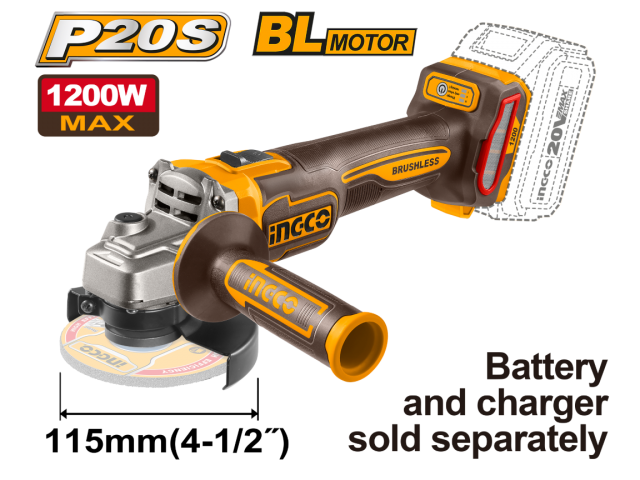 AMOLADORA ANGULAR 4½" 115MM A BAT 20V P20S 1200W BRUSHLESS MOTOR INGCO CAGLI221153