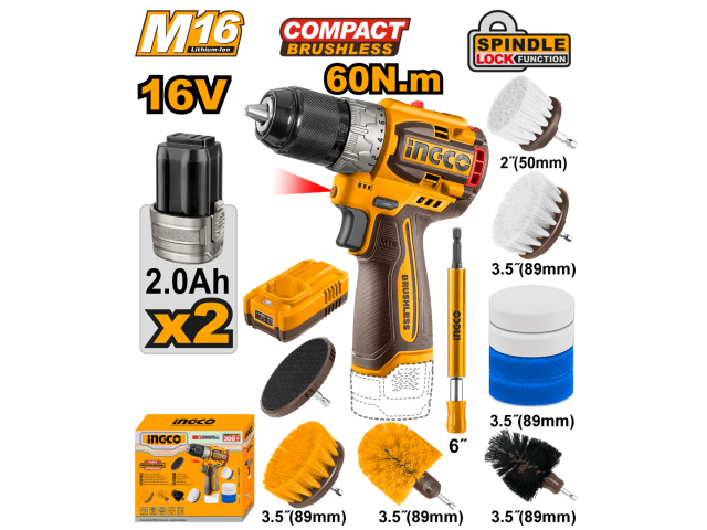 ATORNILLADOR A BATERIA 13MM 60NM COMPACT BRUSHLESS 16V M16 + SET X 11 CEPILLOS DE LIMPIEZA EN CAJA C/2 BAT