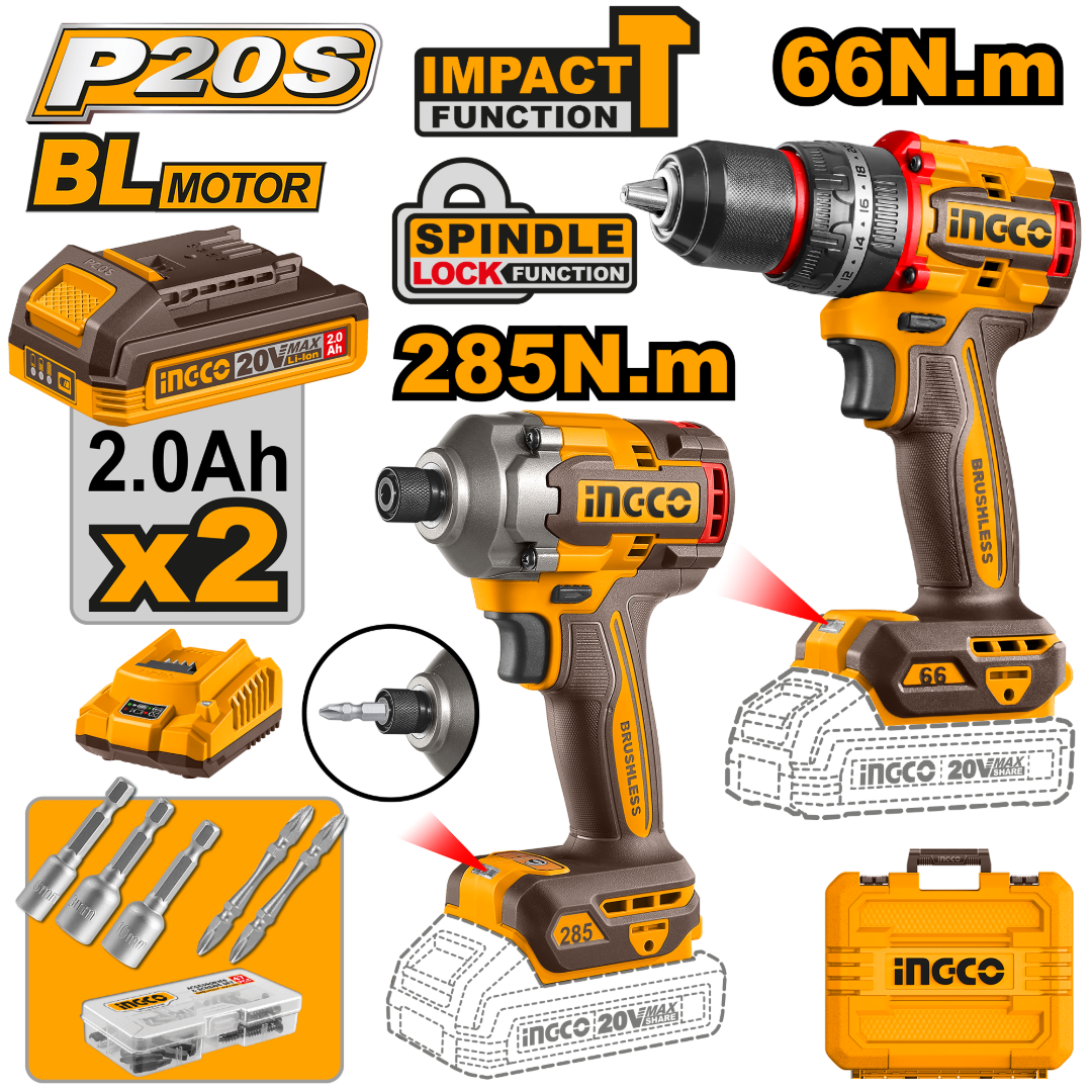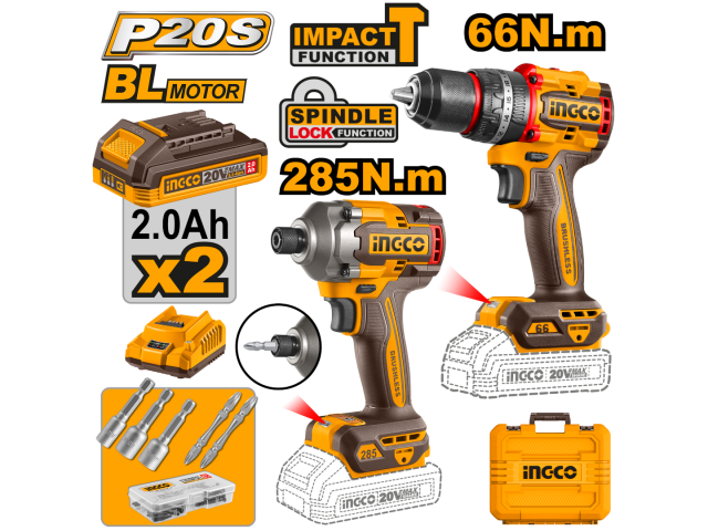 COMBO TALADRO ATORN C PERCUTOR 66NM + ATORNILLADOR DE IMPACTO 20V P20S BRUSHLESS C/2 BAT + CARGADOR + VALIJA + SET ACCESORIOS