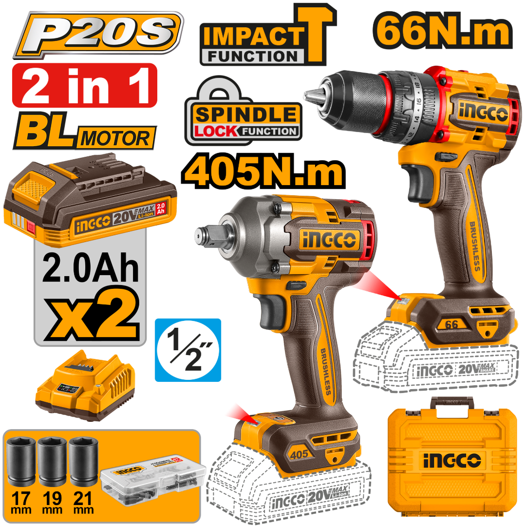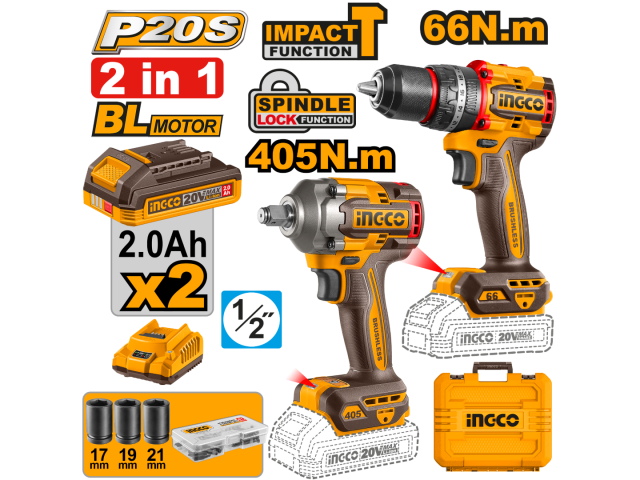 KIT COMBO A BATERIA 20V TALADRO ATORN. C/PERCUTOR 13MM 66NM + LLAVE DE IMPACTO 405NM 1/2" + 2 BAT 2.0AH + CARGADOR + ACCESORIOS + VALIJA