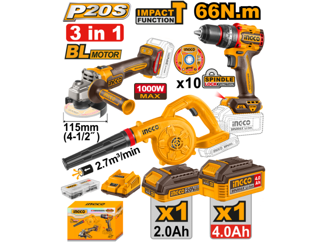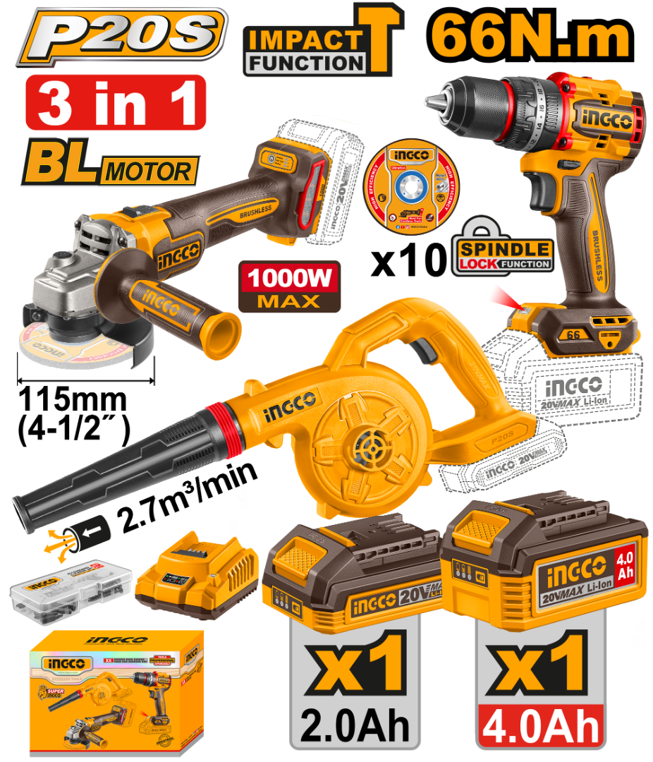 KIT COMBO A BATERIA P20S 20V AMOLADORA ANGULAR 4½" 115MM + TALADRO ATORN. C/PERCUTOR 66NM + SOPLADORA + 2 BAT 4.0AH Y 2.0AH + CARGADOR + ACCESORIOS