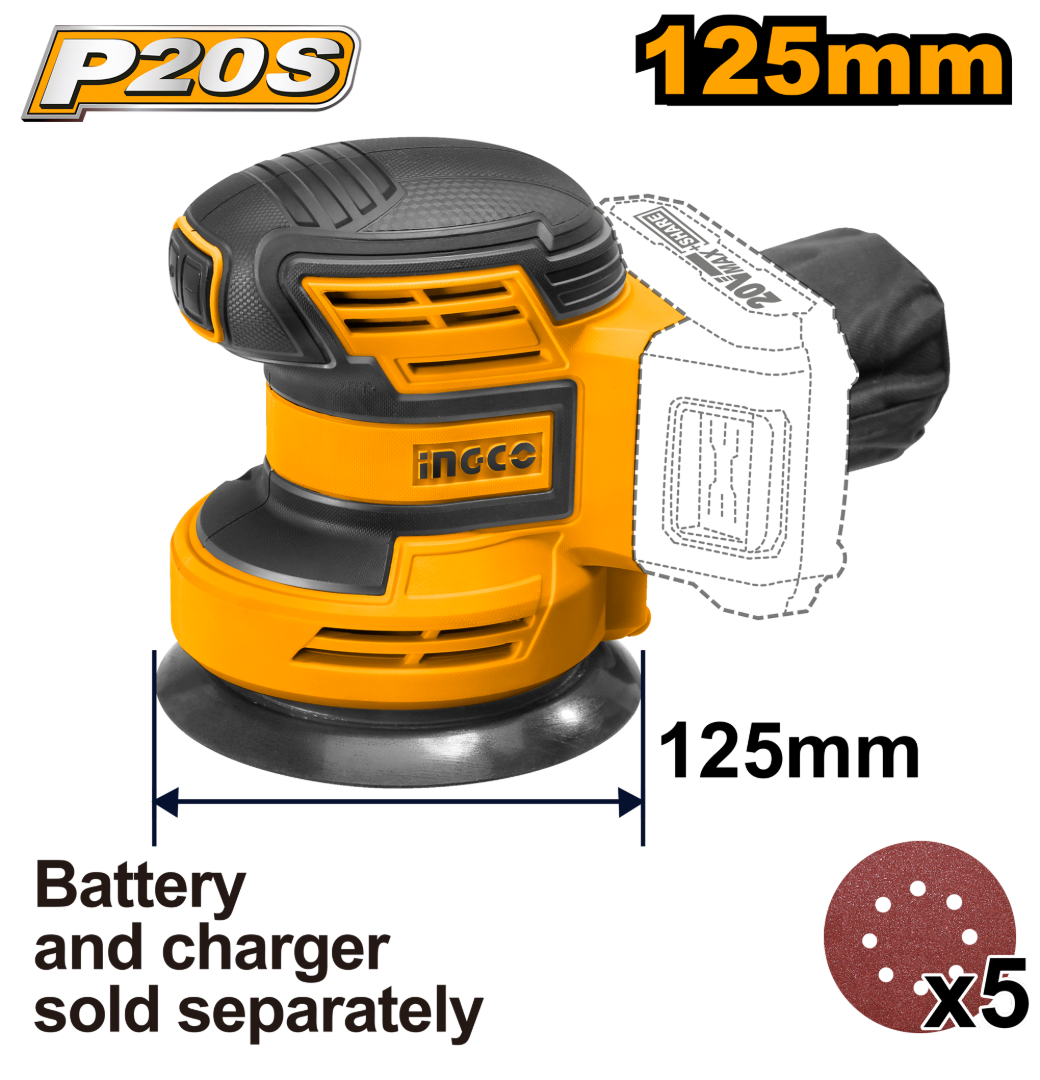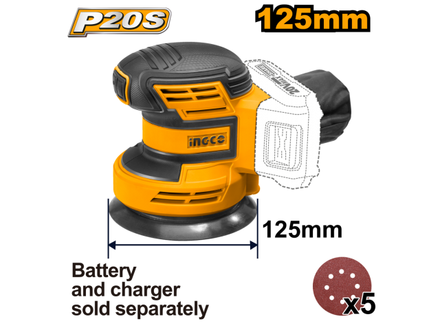 LIJADORA ROTO ORBITAL DE PALMA A BATERIA LITIO 20 VOLT INGCO CROSLI2001 LINEA P20S CON 5 LIJAS