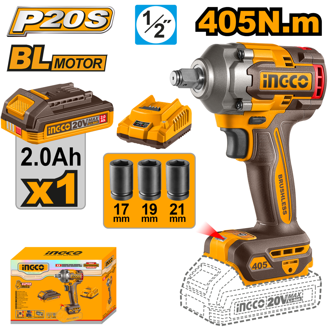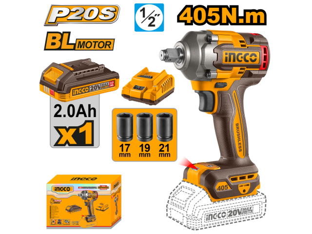 LLAVE DE IMPACTO A BATERIA 20V 405NM 1/2" + BAT 2.0AH + CARGADOR + 2 DADOS 17 19 21MM INGCO CIWLI20455