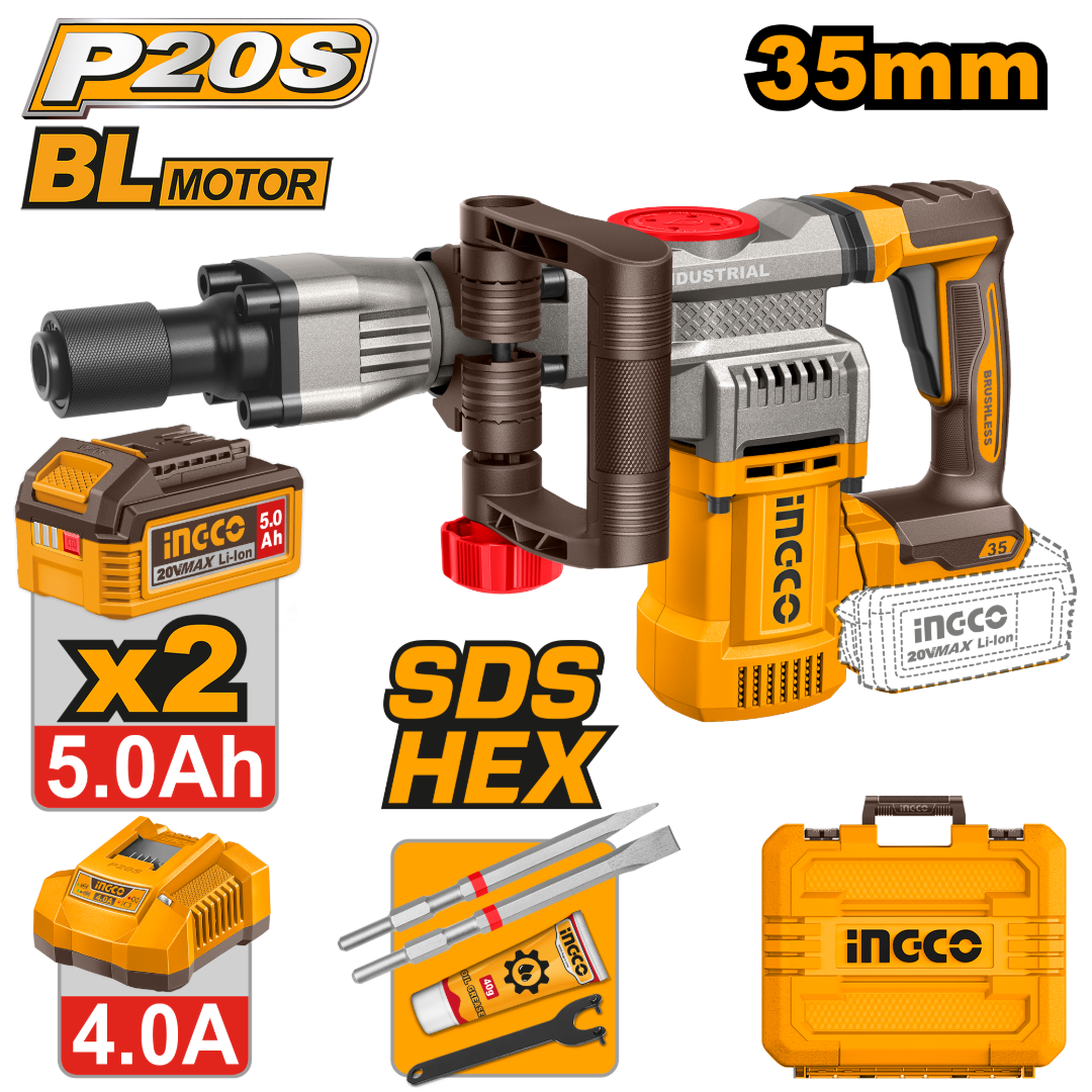 MARTILLO DEMOLEDOR A BATERIA P20S 20V 16J 35MM + 2 BAT 5.0AH + CARGADOR + ACCESORIOS + VALIJA INGCO CDBLI203582