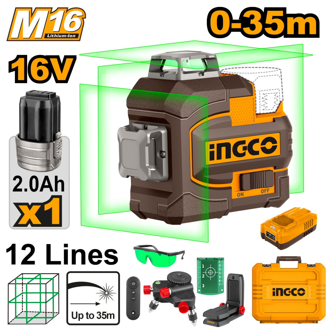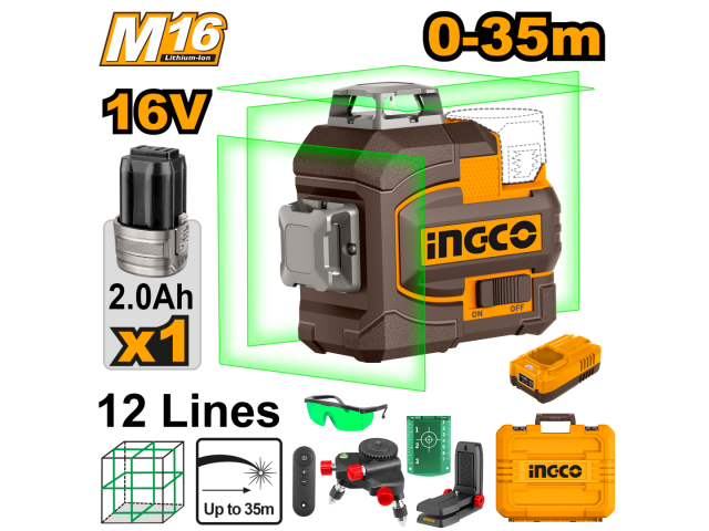 NIVEL LASER AUTONIVELANTE 3D VERDE A BATERIA 35MTS 16V M16 C/BATERIA + VALIJA + ACCESORIOS HLL301201
