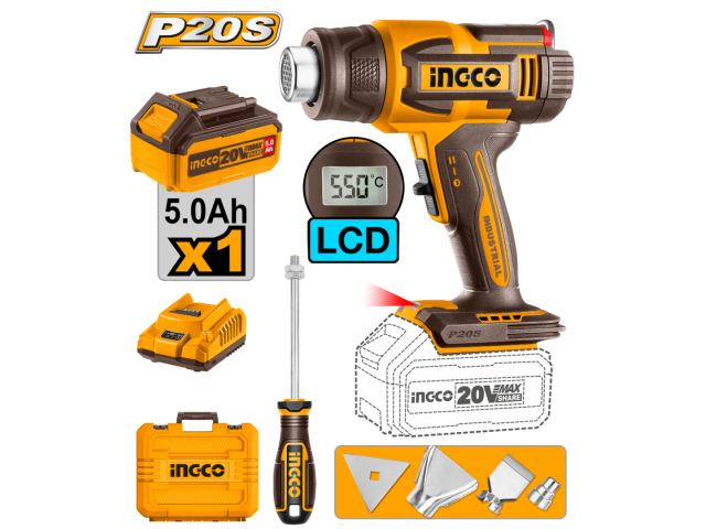 PISTOLA DE CALOR A BATERÍA 5.0AH 20V P20S C/BATERIA + CARGADOR + VALIJA + ACCESORIOS INGCO HGLI20035