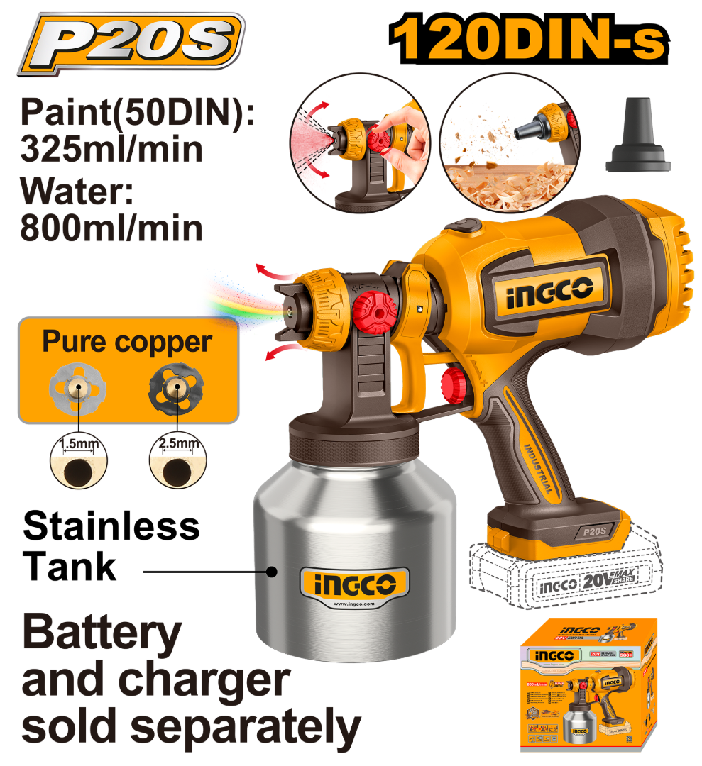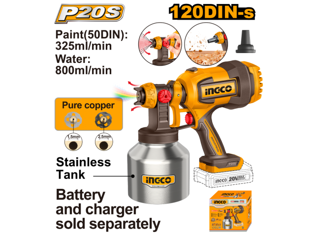 PISTOLA DE PINTAR A BATERIA 20V FLUJO 800ML/MIN TANQUE INOX. + ACCESORIOS, SIN BATERIA SIN CARGADOR INGCO CSGLI20041
