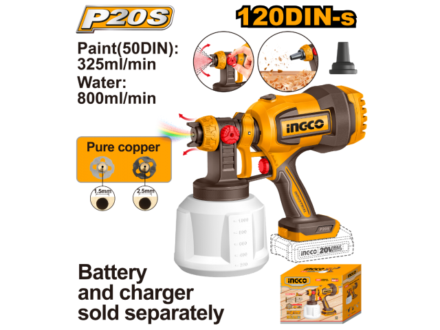 PISTOLA DE PINTURA A BATERÍA P20S 20V C/ACCESORIOS, S/BAT S/CARG INGCO CSGLI2004