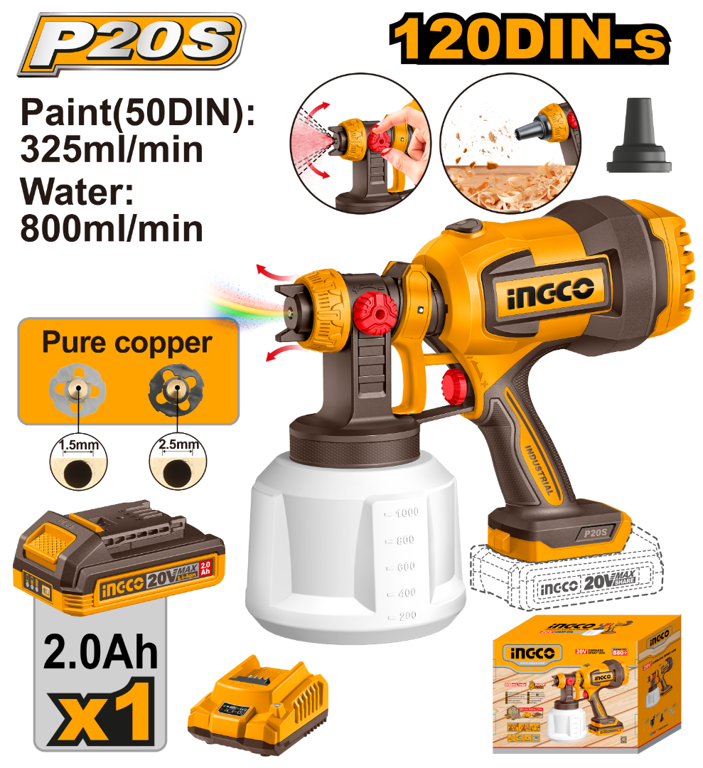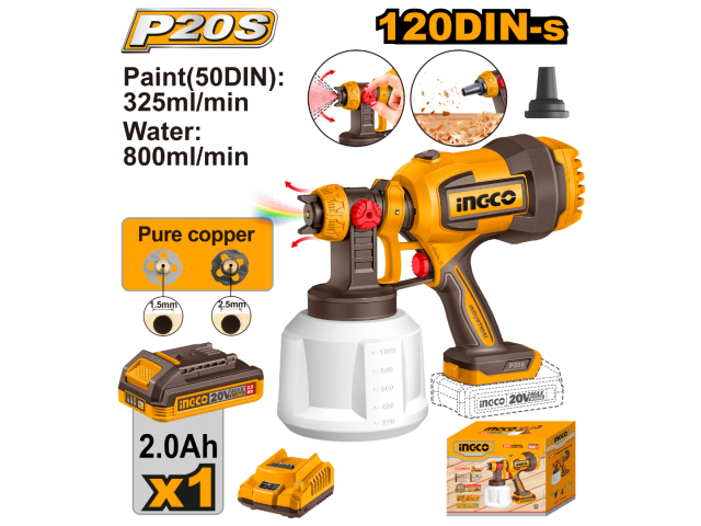 PISTOLA PARA PINTAR A BATERIA P20S 20V + BATERIA + CARGADOR + ACCESORIOS INGCO CSGLI20042