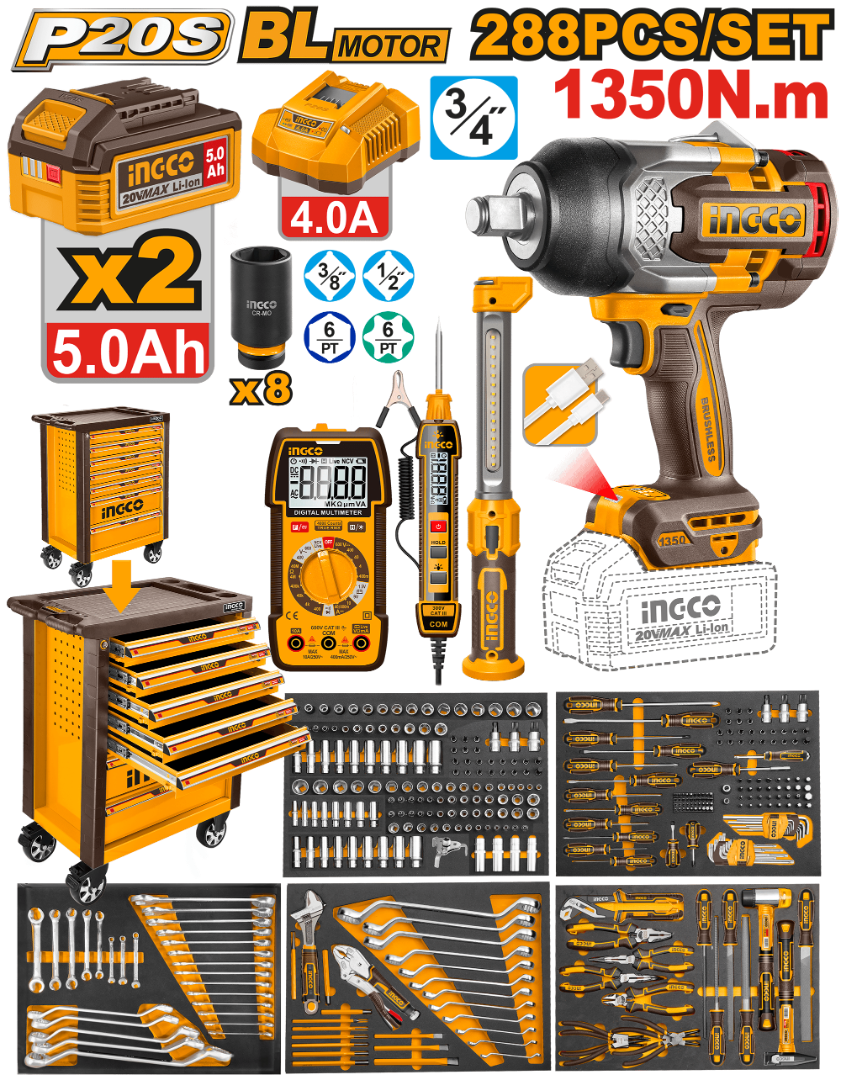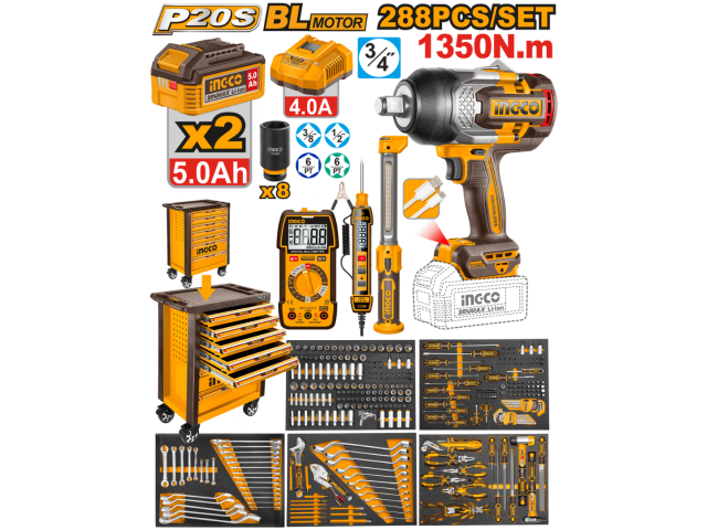 SET 288 HERRAMIENTAS C/ LLAVE DE IMPACTO A BATERIA 3/4" 1350NM 20V + LAMPARA TRABAJO + TESTER AUTOMOTRRIZ + TESTER MULTIMETRO + GABINETE METALICO C/CAJONES + 2 BAT 5.0 AH + CARGADOR INGCO HTCS282882