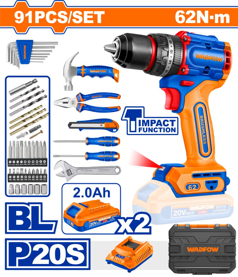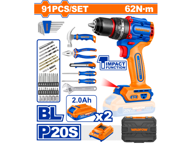 SET DE HERRAMIENTAS 91 PCS + TALADRO ATORN. C/ PERCUTOR 20V 62NM A BATERÍA + 2 BAT + CARGADOR + VALIJA WADFOW WDT4B91