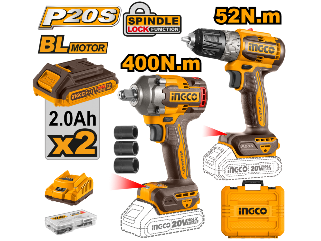 SET LLAVE IMPACTO 20V 400NM + ATORNILLADOR 20V 52NM C 2BAT CARG Y VALIJA INGCO CKLI20271