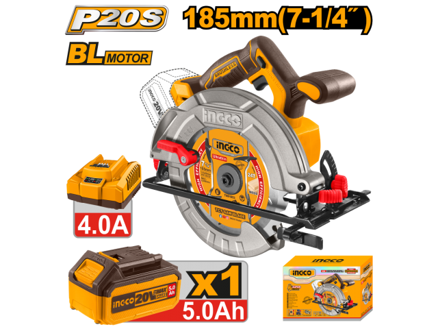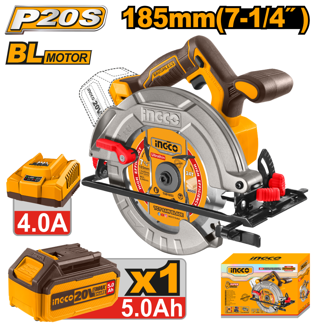 SIERRA CIRCULAR A BATERIA 20V P20S BRUSHLESS MOTOR 185MM C/BAT + CARGADOR + ACCESORIOS INGCO CSLI18513