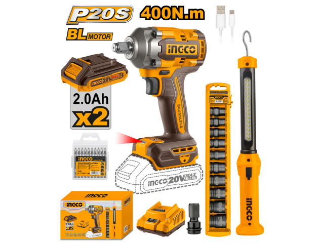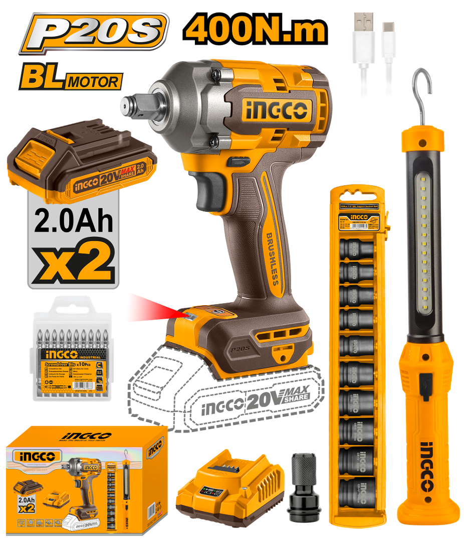 SUPER COMBO LLAVE DE IMPACTO 400NM 20V + LINTERNA RECARGABLE + DADOS IMPACTO